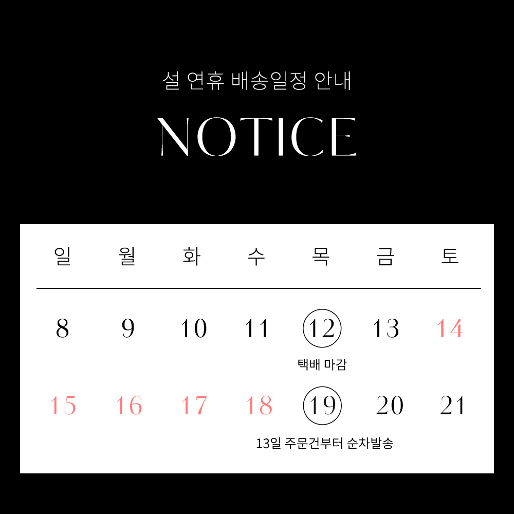 1. 배송기간은 주문일(무통장입금은 결제완료일)로부터 최대 3일이내에 발송됩니다. 공휴일 or 주말은 출고가 진행되지 않으며 돌아오는 평일에 발송처리 됩니다. 예약 배송 상품의 경우는 예약 배송일 기준으로 적용됩니다.